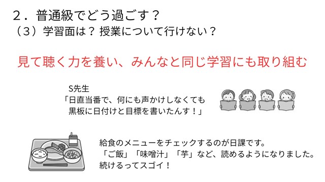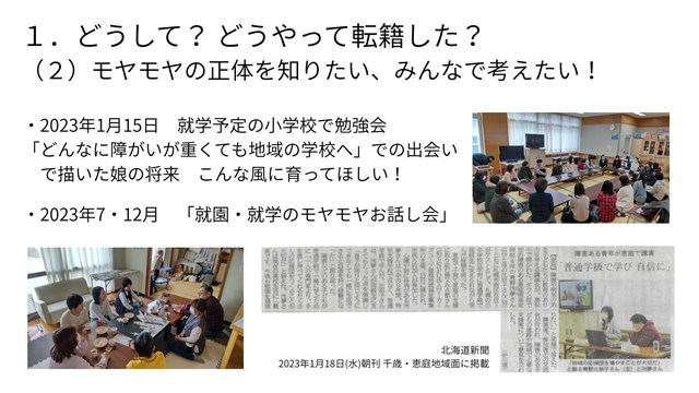 【1.どうして? どうやって転籍した?】【2.普通級でどう過ごす?】【3.地域へ思いを広げたらどうなる?】のテーマで報告します。資料の一部を公開します!