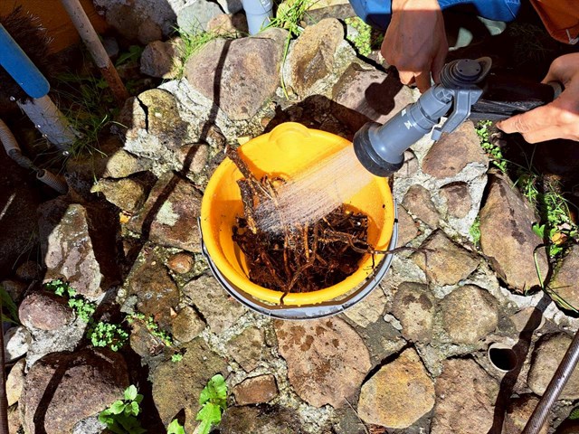 会場の三島会館に戻って、歯ブラシで根を洗い、包丁でそぎ切りにしました。