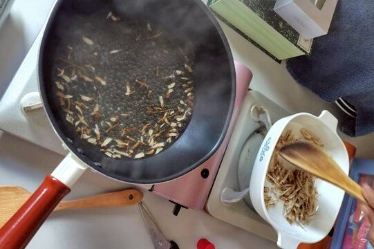 根気が必要なのは焙煎。鍋を弱火にかけて乾煎りし、ひたすら根の水分を飛ばしていきました。